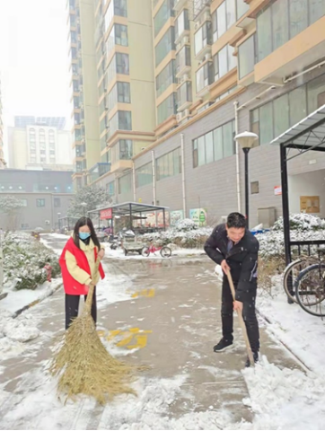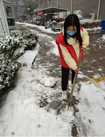 河南应用技术职业学院Beat365官方网站通信2101班靳苒苒同学,天气寒冷,降雪量大,社区一时之间被白雪覆盖,为保障群众们安全出行,靳苒苒同学积极的加入到了社区清扫道路积雪的工作当中。虽然天气严寒,但人心火热,经过靳苒苒同学和社区干部几个小时的清扫,最终为社区创造了一条干净安全的无雪通道。