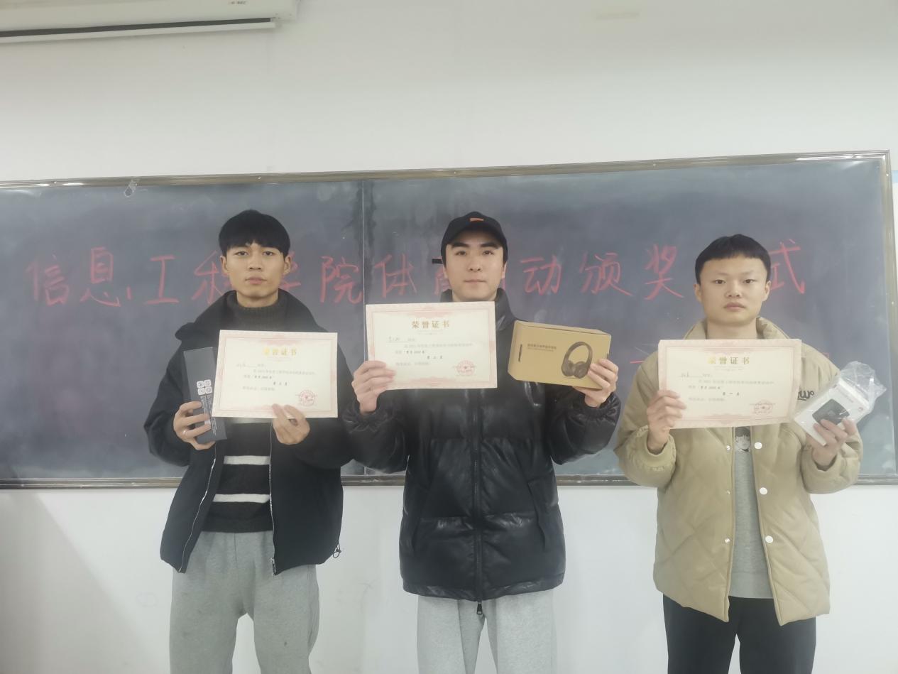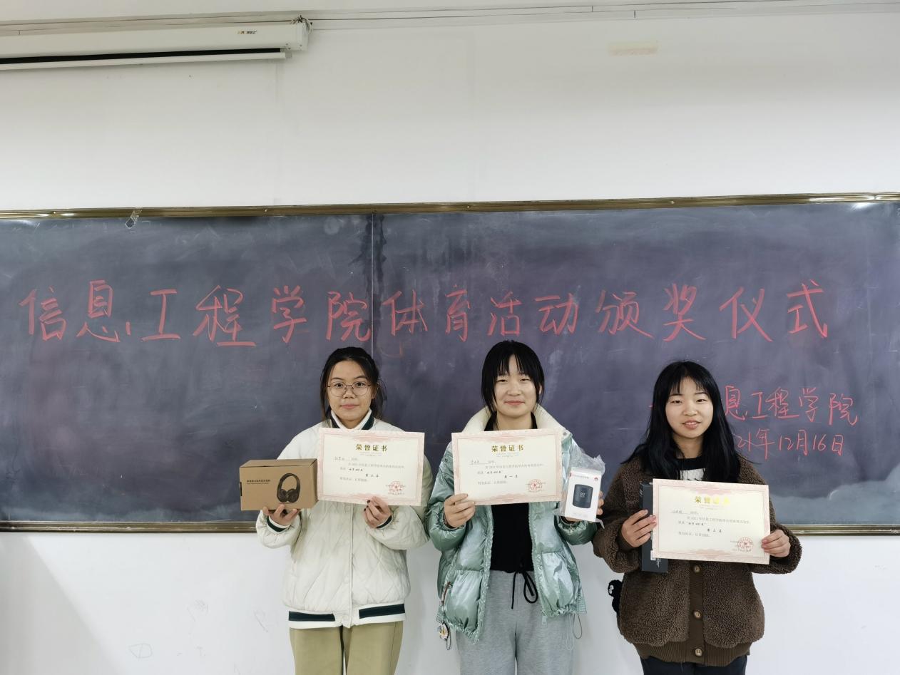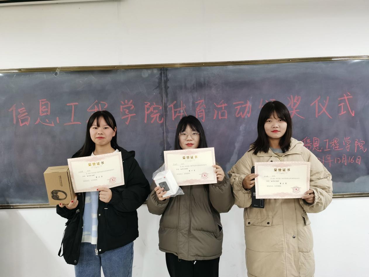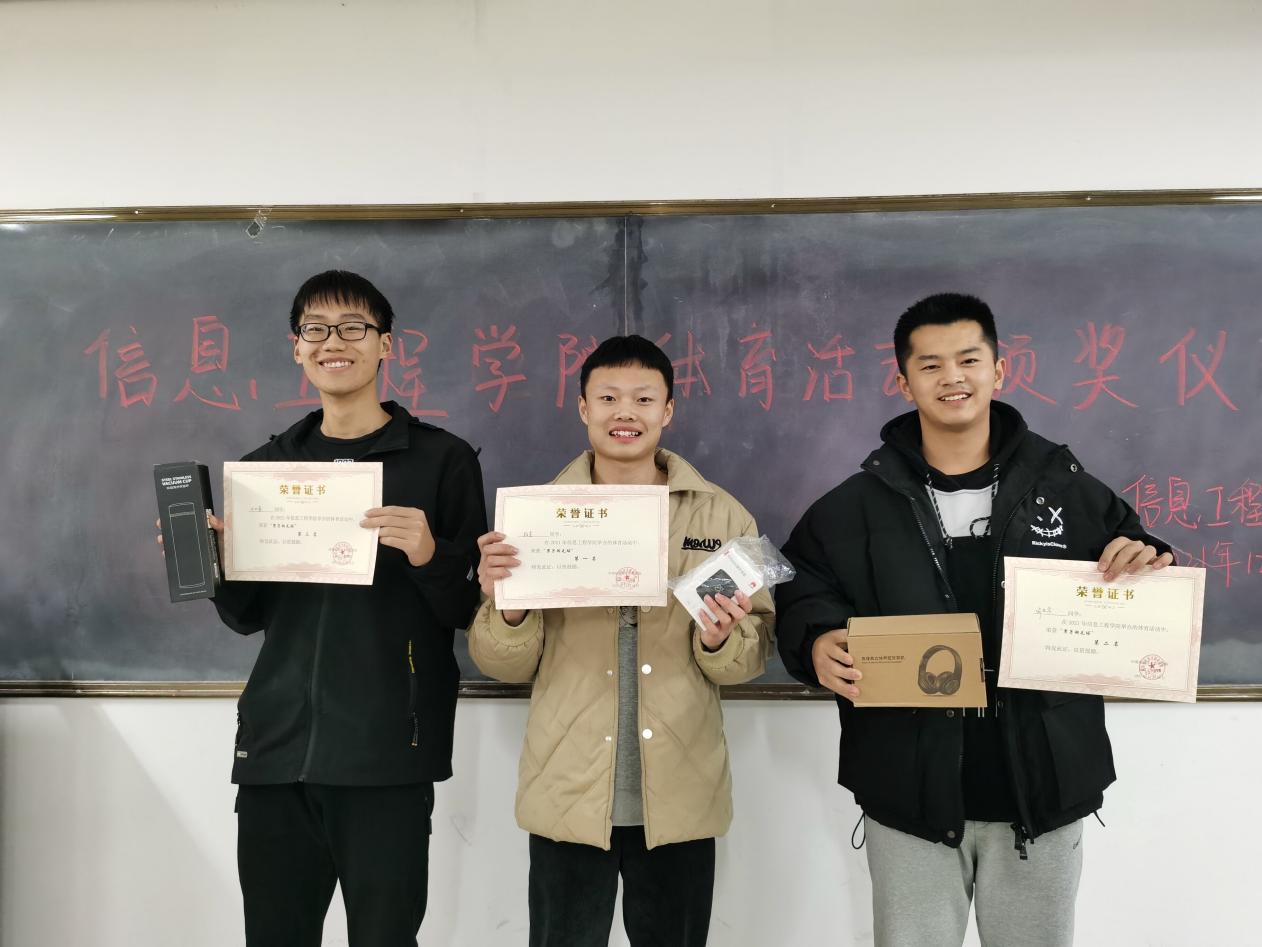 本次活动能够顺利举办,不仅有运动健儿们的努力,还有学生会各个部门的配合和支持。经过历时半个月的激烈角逐,此次体育比赛各个项目的季亚冠军均已产生。随后,由主席团吴迪,靖婉秋和文体部部长喻忠意为获奖运动员颁发证书和奖品。