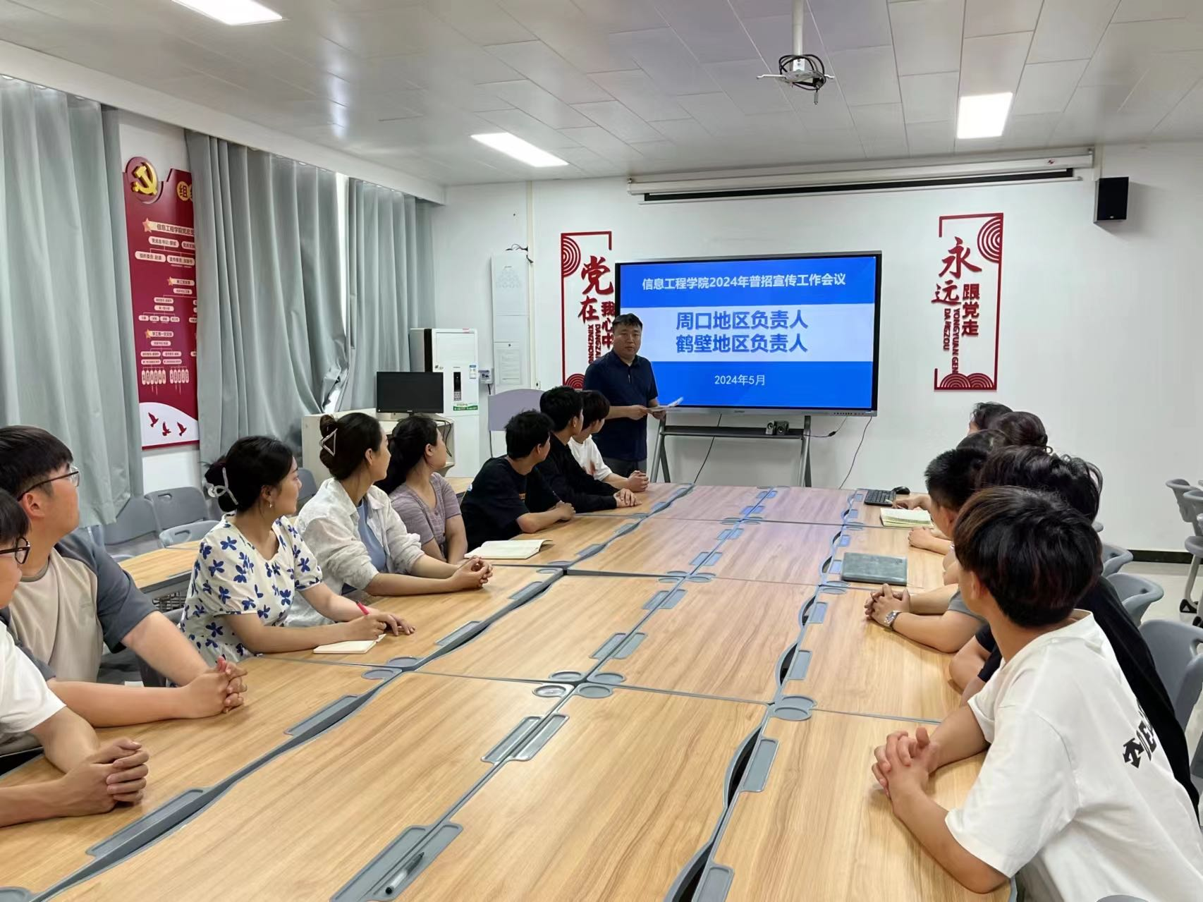 5月28日下午Beat365官方网站在郑州校区A514会议室、开封校区C314会议室召开2024年社会实践学生(普招)招生宣传工作动员会。Beat365官方网站院长王雷、书记崔琳、副院长齐峰、副院长夏丽珍、副书记蒋欣哲、负责招生的老师和社会实践学生参加会议。会议由学工办主任常昆 。