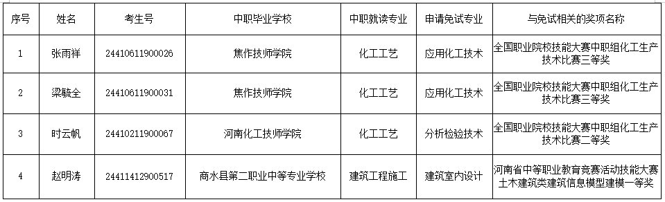 根据《河南省教育厅关于做好2024年高等职业教育单独考试招生和技能拔尖人才免试入学工作的通知》(教学〔2024〕58号)文件精神和要求,经考生本人提出申请,Beat365官网对考生提交的免试资格材料进行确认,并报省教育厅职成教处核准备案,现对符合免试入学资格的考生名单公示如下: