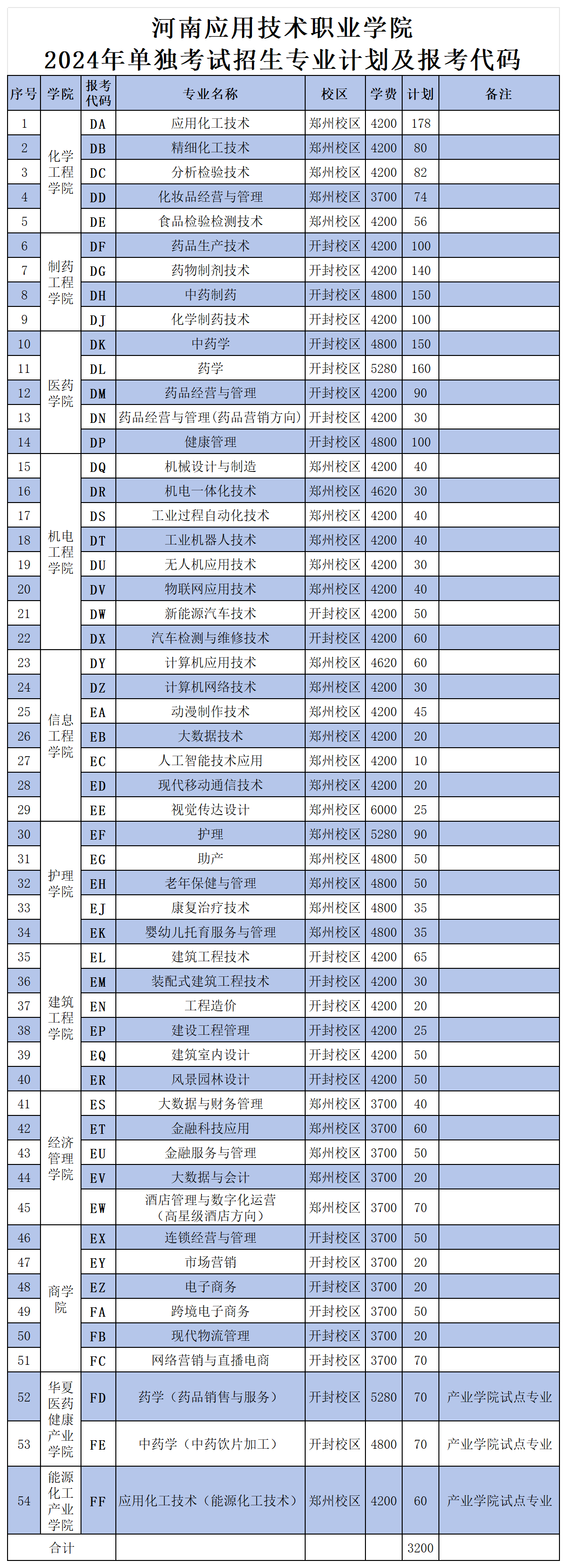 开封校区:药品生产技术、药物制剂技术、中药制药、化学制药技术、中药学、药学、药品经营与管理、药品经营与管理(药品营销方向)、健康管理、新能源汽车技术、汽车检测与维修技术、建筑工程技术、装配式建筑工程技术、工程造价、建设工程管理、建筑室内设计、风景园林设计、连锁经营与管理、市场营销、电子商务、跨境电子商务、现代物流管理、网络营销与直播电商、药学(药品销售与服务方向)、中药学(中药饮片加工方向)
