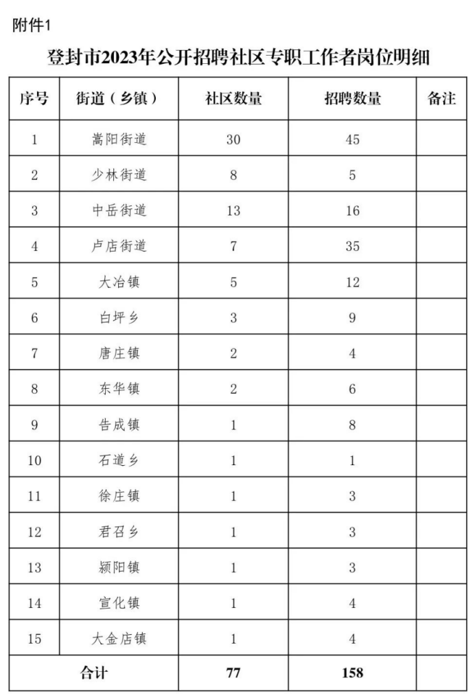 本次计划为全市15个乡(镇)、街道公开招聘158名社区专职工作者,其中01岗位面向登封市国有企业下岗职工招聘10人,02岗位面向社会公开招聘148人。(具体岗位明细见附件1