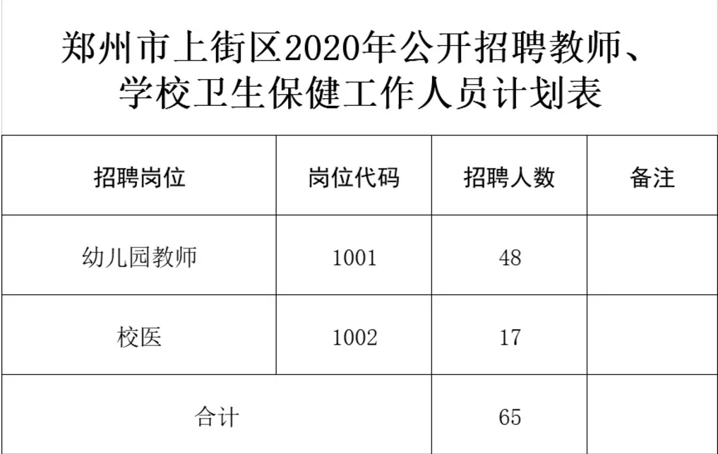 招聘幼儿园教师48名,学校卫生保健工作人员17名,具体招聘岗位、人数等详见《郑州市上街区2020年公开招聘教师、学校卫生保健工作人员计划表》(见附件)。