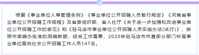 2020年驻马店市市直15个部门所属37个事业单位面向社会公开招聘工作人员147名,其中:市发改委3名、市教育局12名、市民宗局1名、市司法局3名、市水利局25名、市文广旅局3名、市卫健体委23名、市应急局12名、市招商局4名、市大数据局8名、市扶贫办5名、市机关事务中心6名、市住房公积金中心5名、市农科院7名、市城乡一体化示范区管委会30名。招聘岗位详见《2020年驻马店市市直部分部门所属事业单位公开招聘工作人员岗位表》(附件1)。